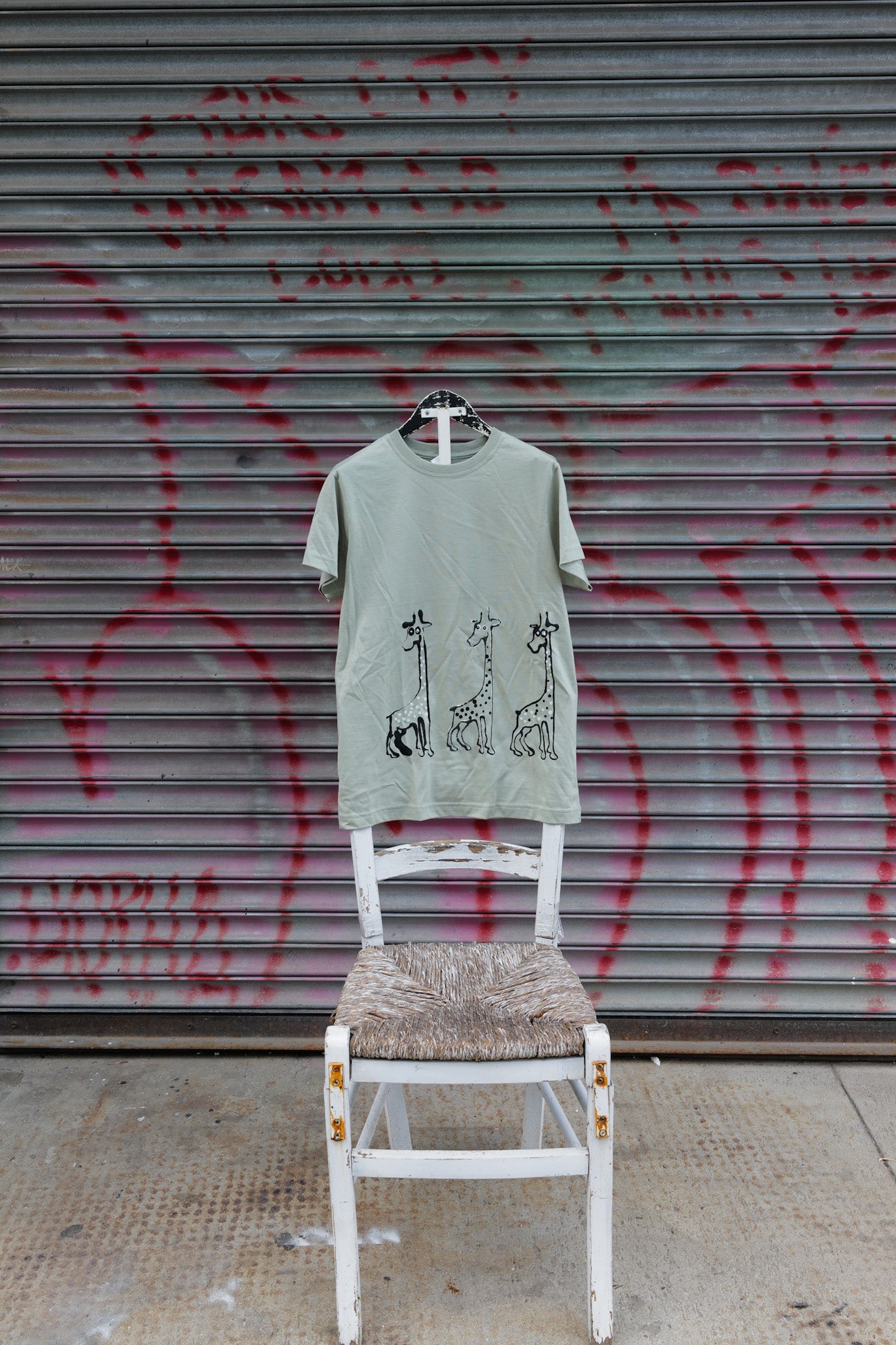 Hand-painted composition featuring three towering giraffes, their elongated silhouettes forming a rhythmic procession across the fabric. The figures speak in quiet harmony — part totem, part dreamscape — evoking balance, vision, and kinship. Both whimsical and monumental, the trio becomes a moving mural, alive with presence and poise.