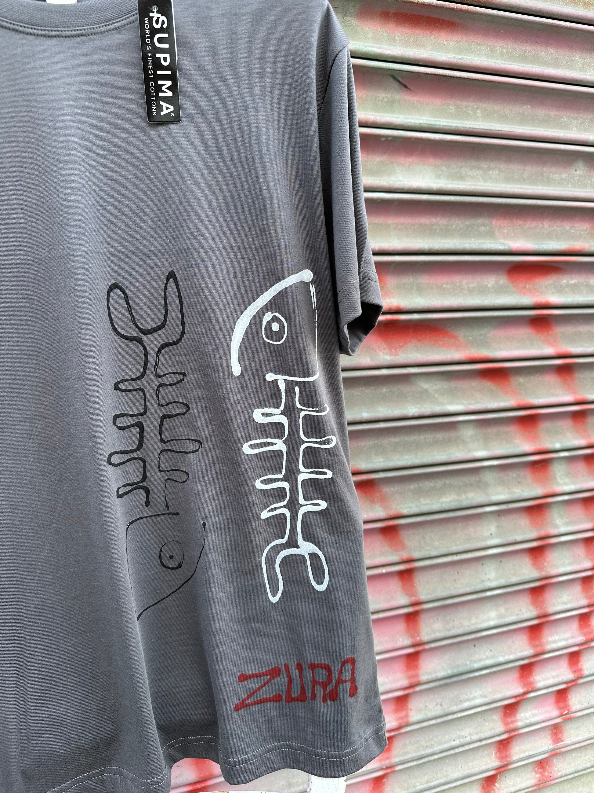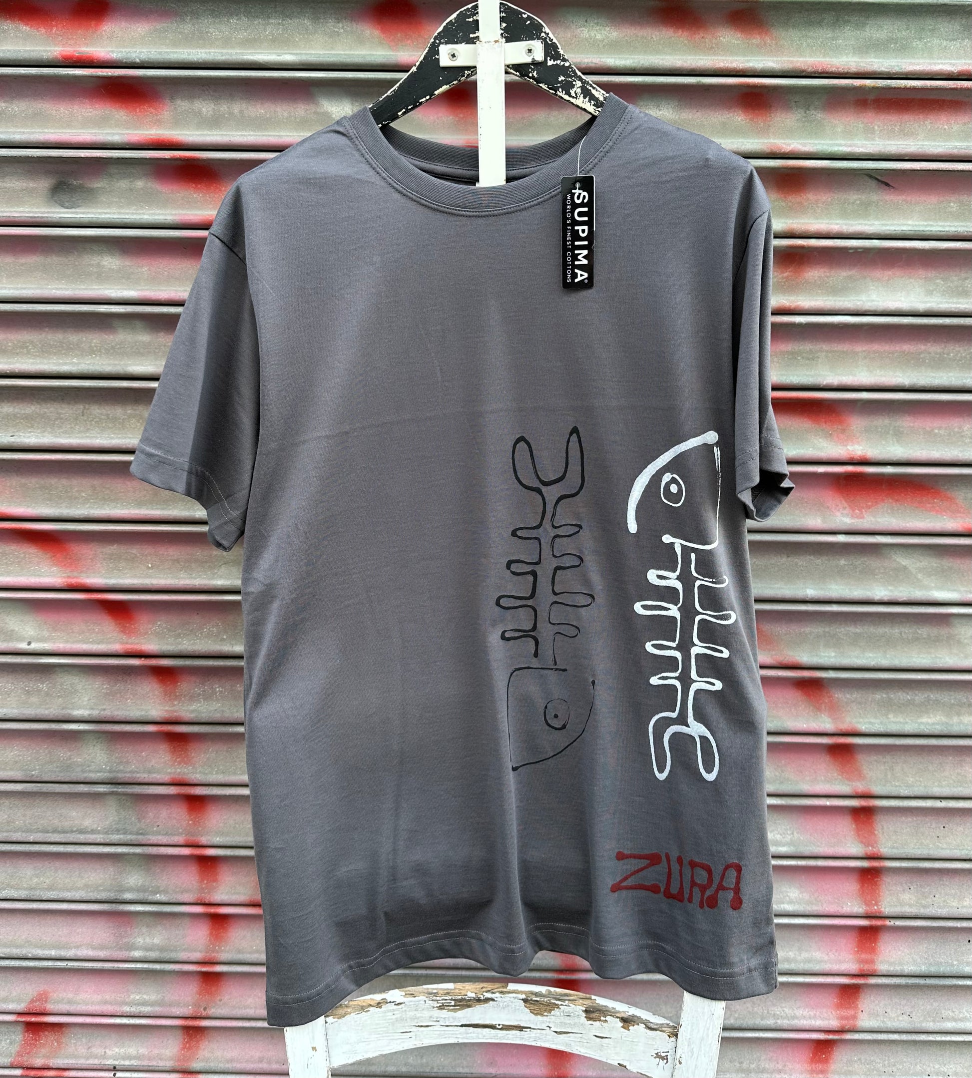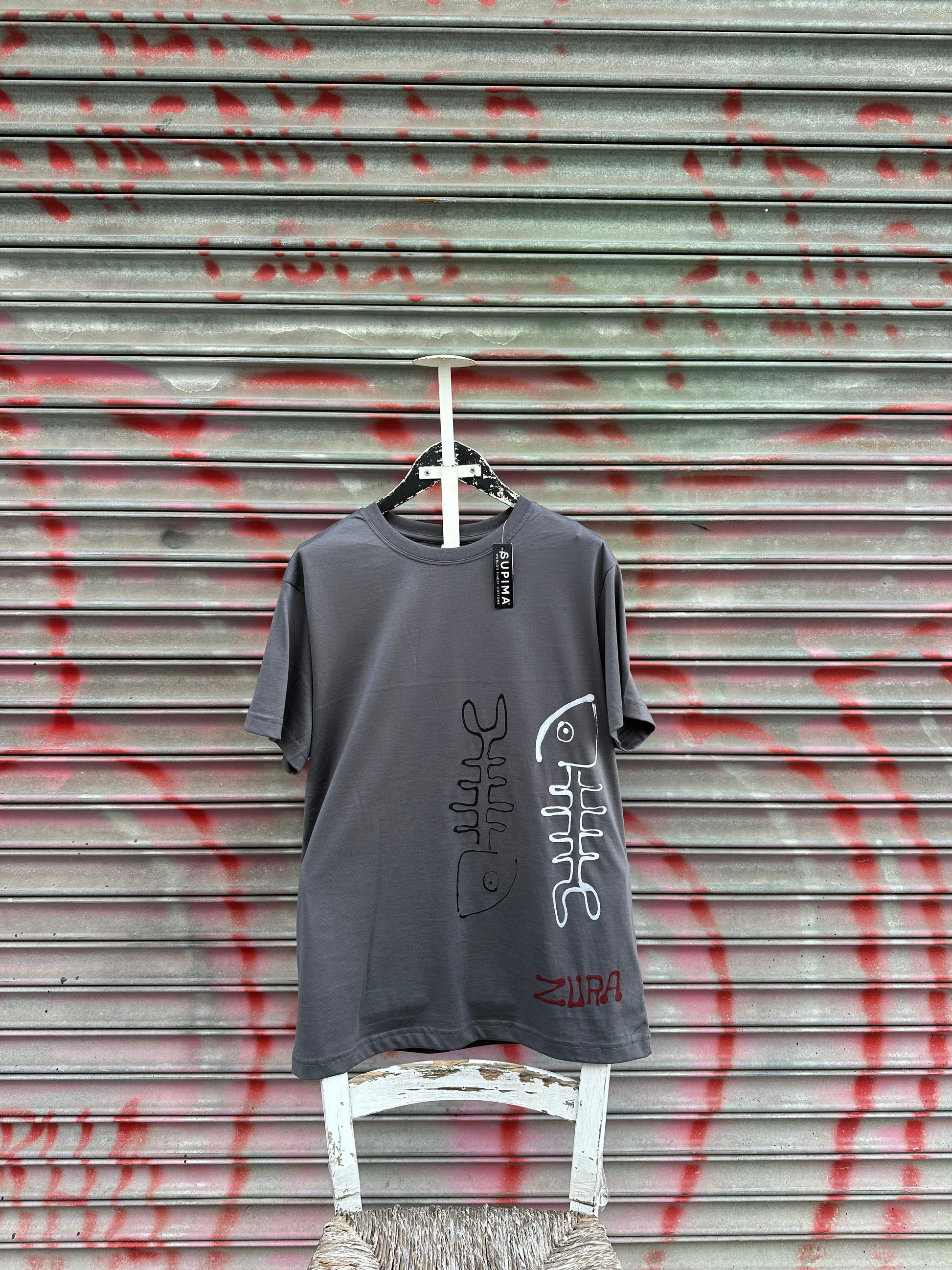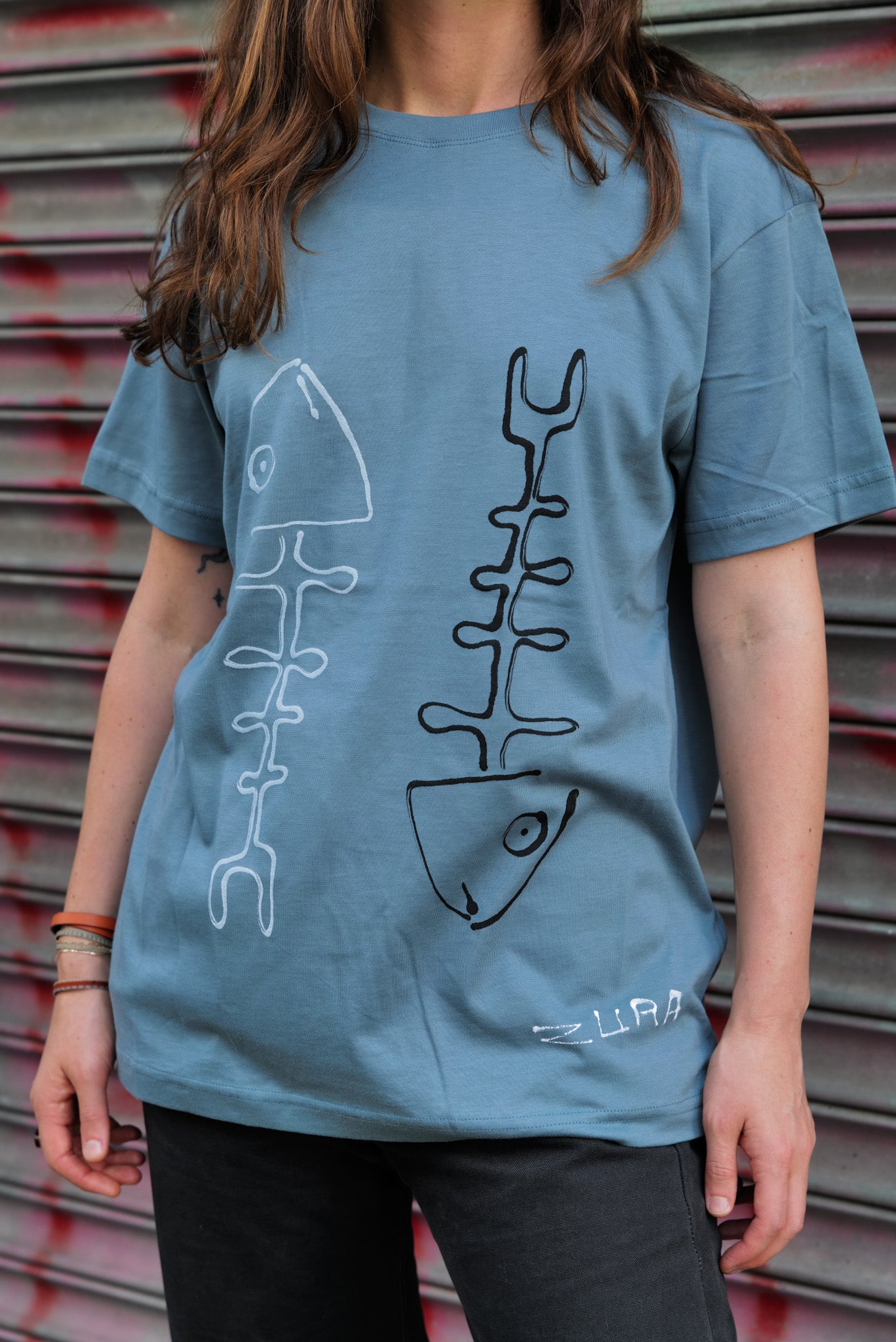 Hand-painted composition featuring two skeletal fish, their delicate forms suspended in an imagined aquatic space. Both playful and haunting, the mirrored bones evoke fragility, rhythm, and the hidden currents of life beneath the surface — a street-poetic still life transformed into wearable art.