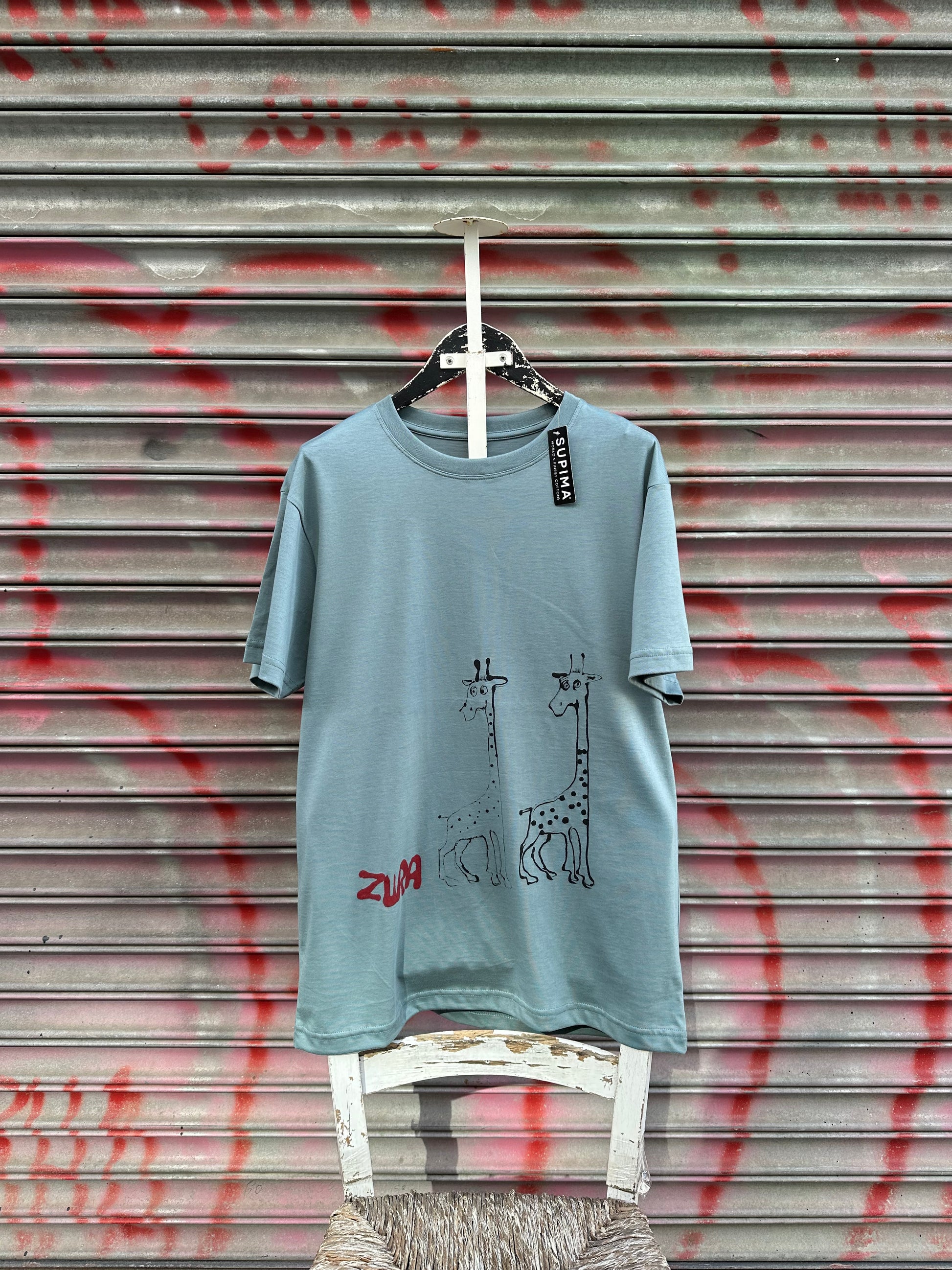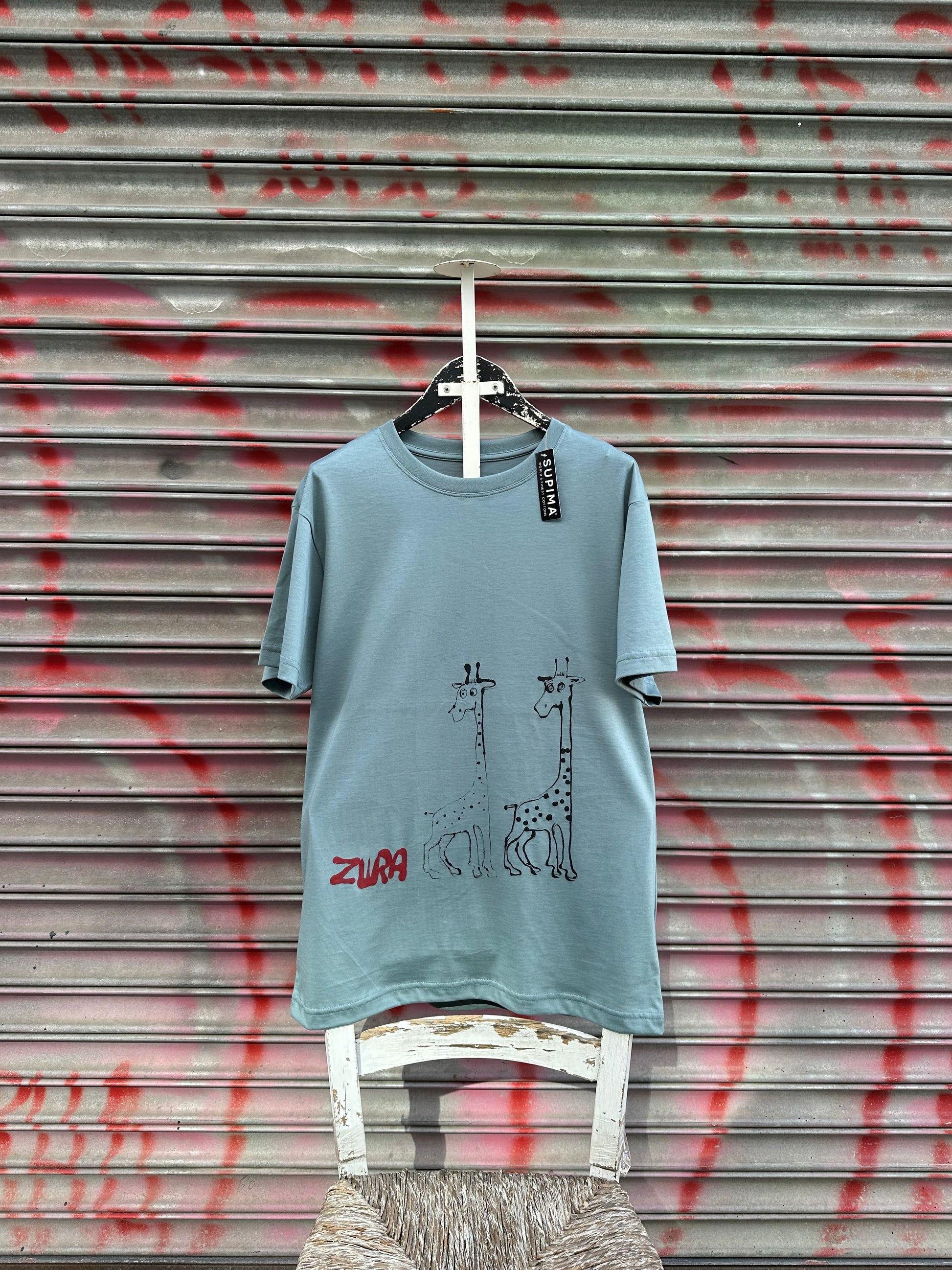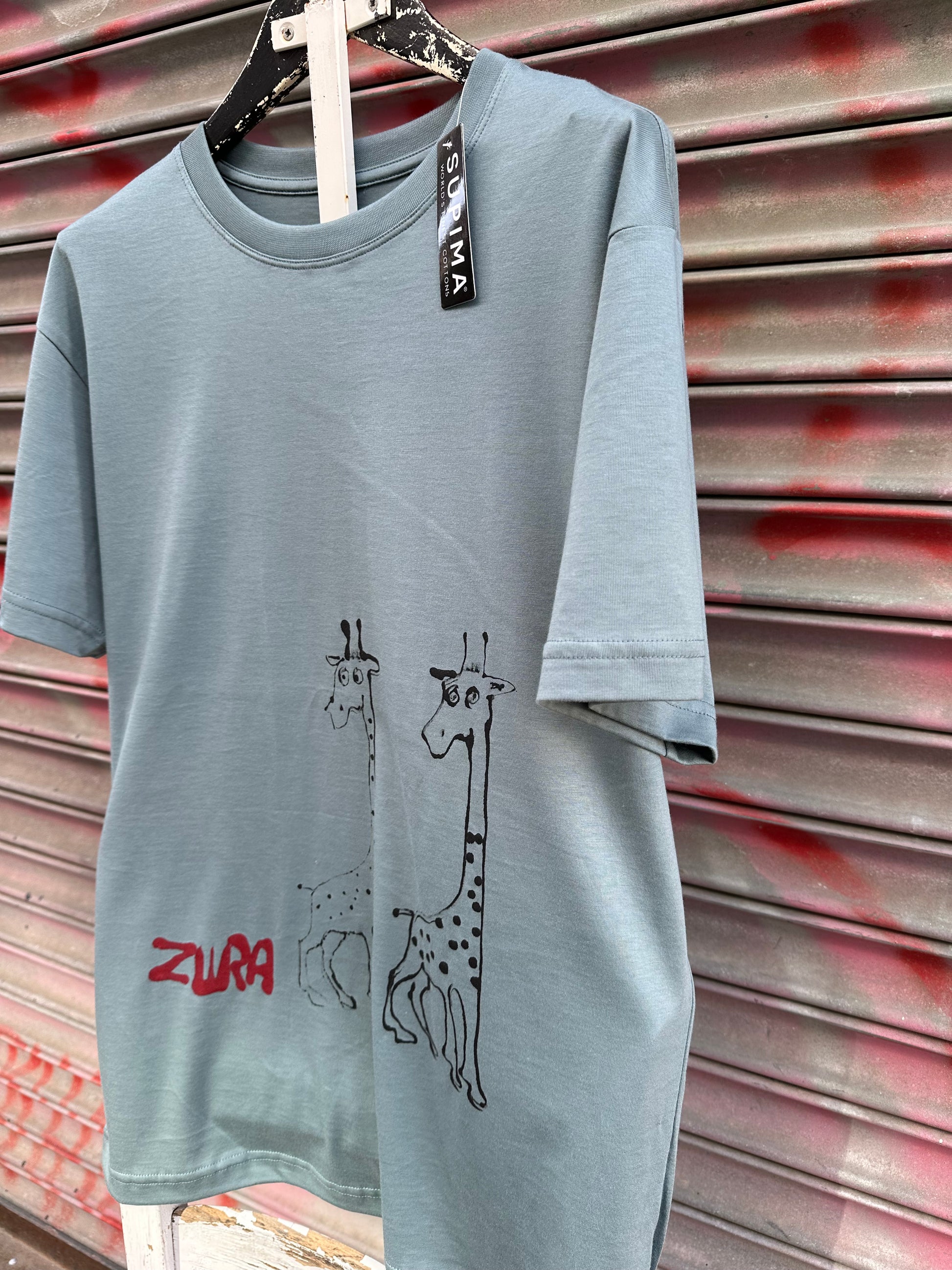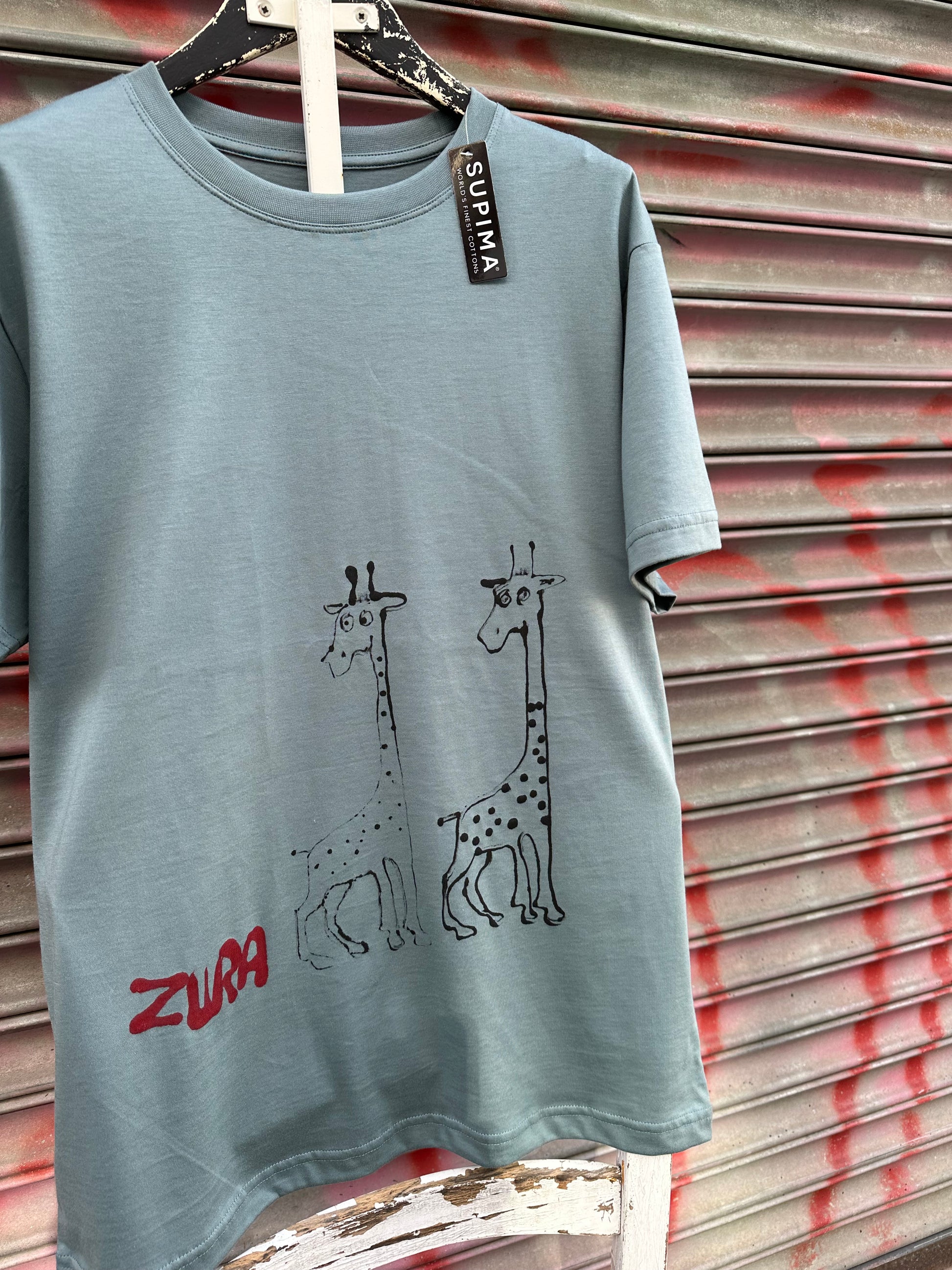 Hand-painted composition featuring a pair of giraffes, their elongated forms rising like columns of quiet grace. At once tender and monumental, the mirrored figures suggest companionship, perspective, and heightened vision — a surreal still life stretched across the fabric.