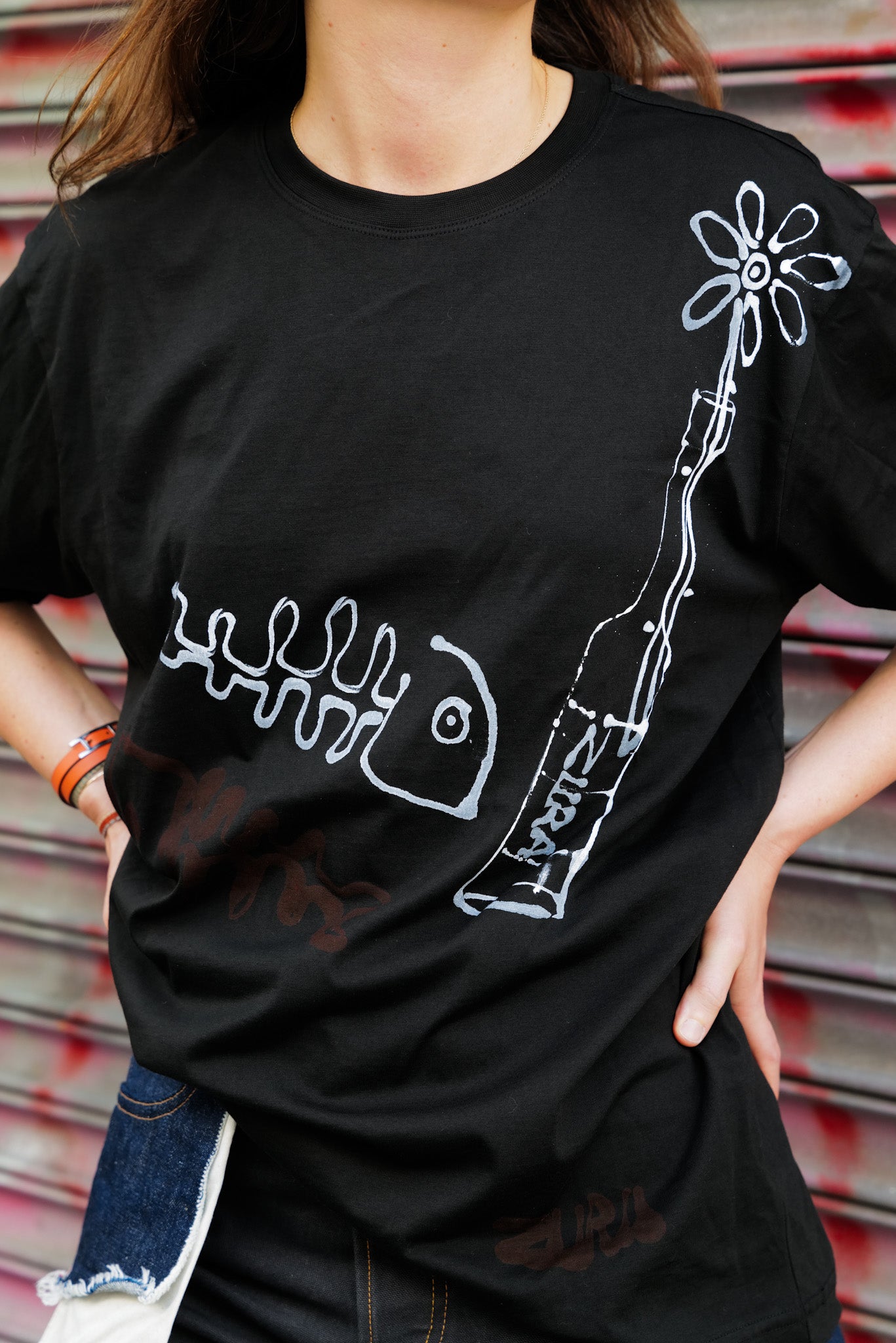 Hand-painted composition featuring two skeletal fish and a lone bottle with a flower rising from it. A playful echo of classical still life turned street-poetic — raw, delicate, and utterly one-of-a-kind.