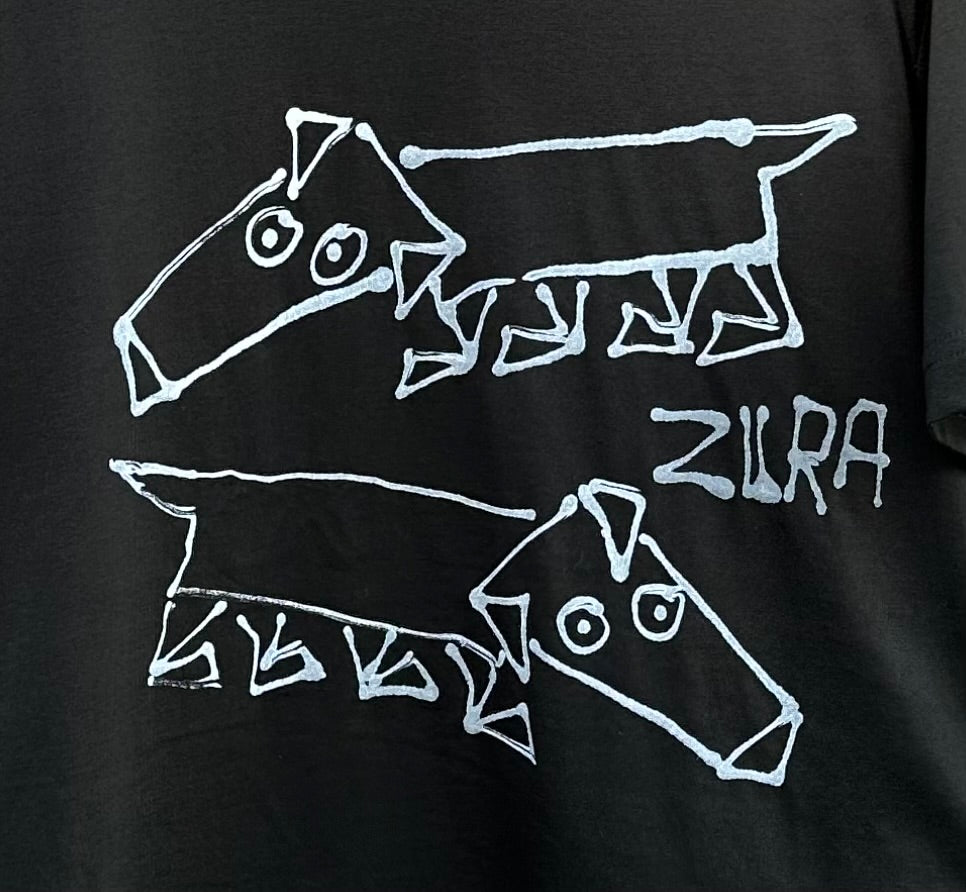 Hand-painted composition featuring two elongated hounds moving in tandem — mirror forms that echo loyalty, rivalry, and rhythm. Both playful and haunting, the doubled figures stretch across the cotton like a living frieze, transforming motion into myth.